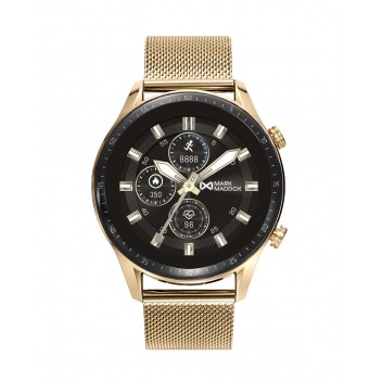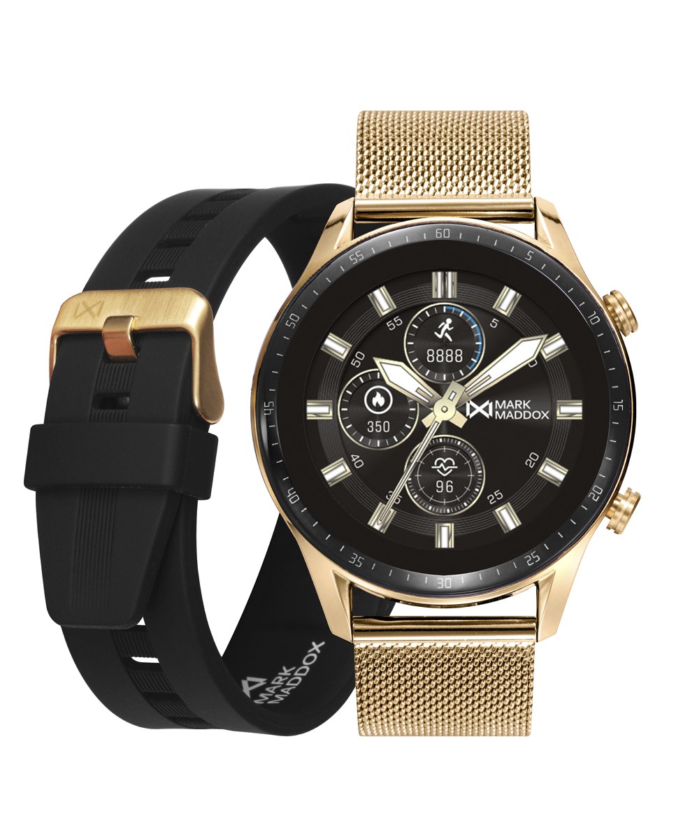 Smartwatch Mark Maddox Smartnow, con caja de aluminio Ip dorado,correa de silicona negra y malla milanesa , pantalla táctil, son compatibles con teléfonos con un sistema operativo Android 5 o superior (excepto la edición Go) o iOS 10 o superior. Las funciones admitidas pueden variar entre plataformas y países. Funciones, , aviso de llamada, y podras ver notificaciones, mensajes, conocer tu presión arterial, oxígeno en sangre, cuentapasos, distancia realizada, gestión de deportes, cronómetro, controlar tu calidad de sueño, definir alarmas, disparar la cámara de tu móvil de forma remota, controlar la música de tu móvil, localizar tu teléfono.