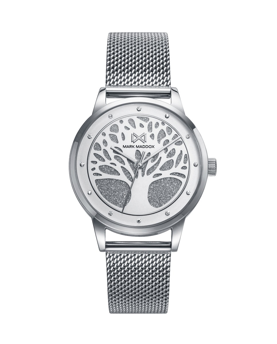 Reloj de mujer Mark Maddox SHIBUYA de esfera plateada con arbol de la vida, fondo glitter y malla milanesa de acero con cierre deslizante que facilita su ajuste.