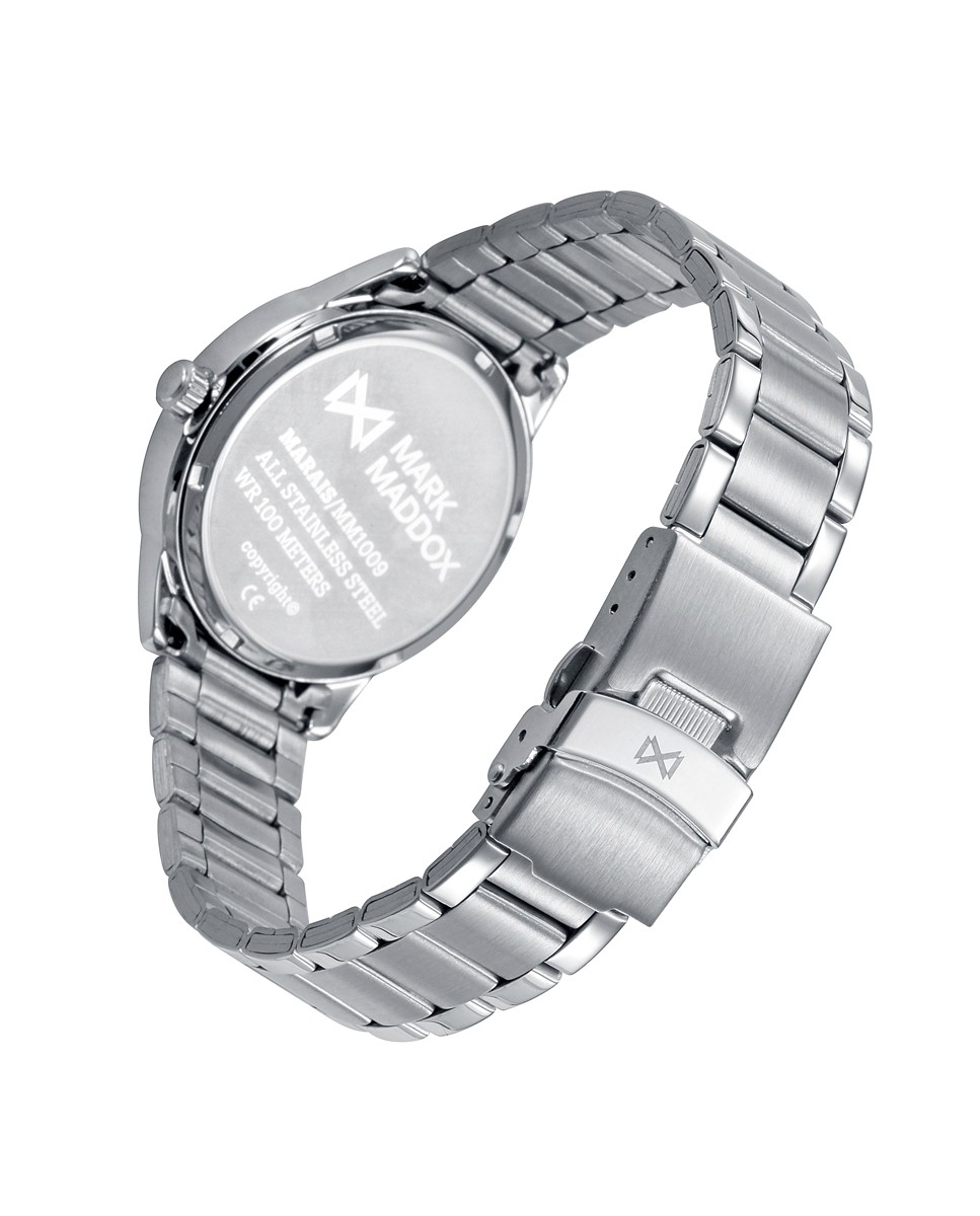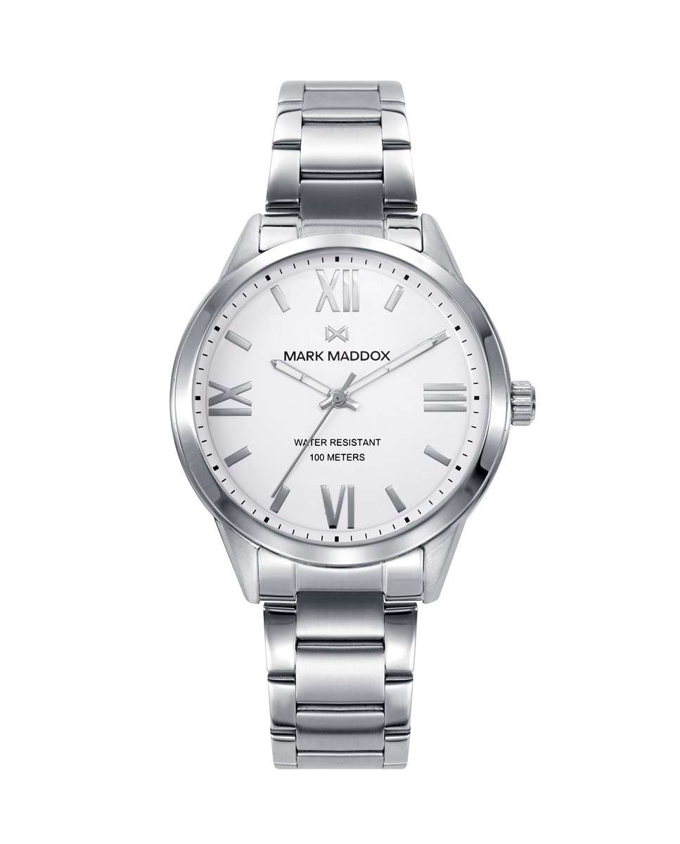 Reloj de mujer Marais Mark Maddox tres agujas con caja y brazalete en acero, esfera blanca.