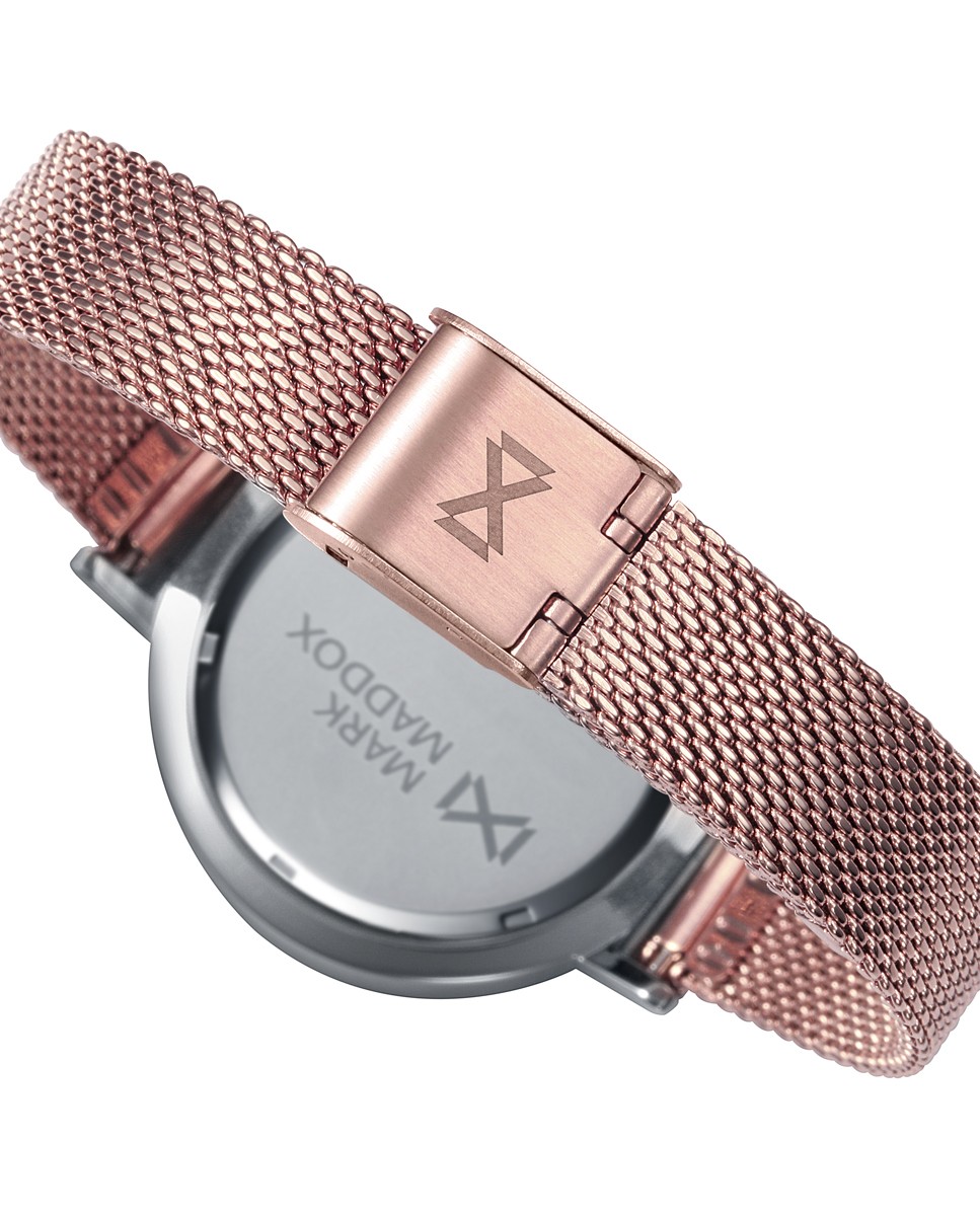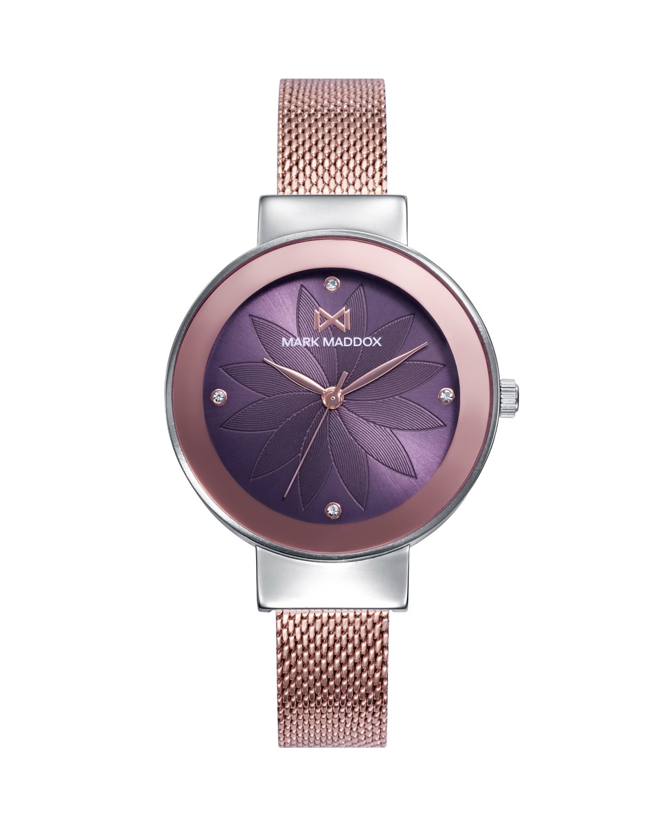 Reloj de Mujer Mark Maddox Catia, tres agujas, caja y malla milanesa en acero Ip rosa, con los terminales de caja de color plata, esfera morada y agujas en color rosa.