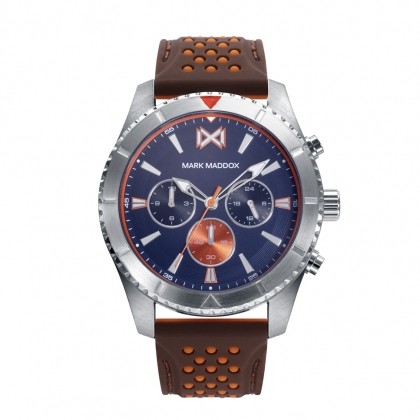 Reloj de Hombre Mark Maddox Mission, multifunción,caja en acero con correa silicona marron con motivos en naranja,esfera azul con subesfera de las 6 en color naranja al igual que el segundero