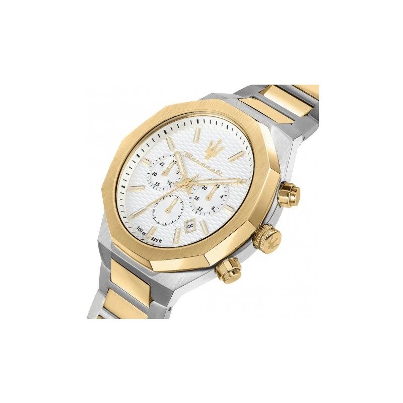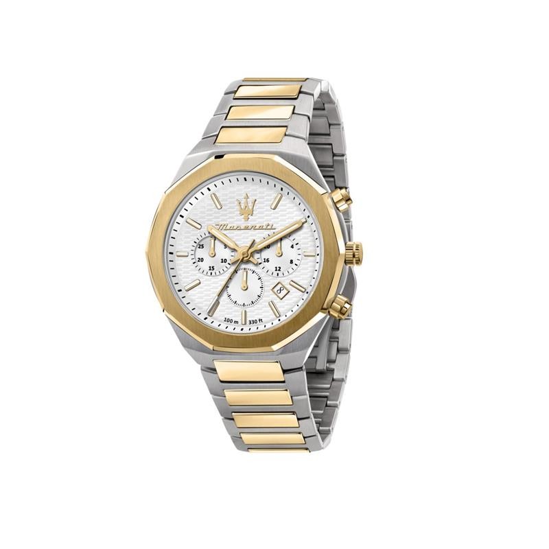 Reloj Maserati para hombre de la colección Stile fabricado en acero inoxidable plateado y dorado. Estamos ante un reloj de diseño elegante con un toque atrevido. Cuenta con caja de 45mm de diámetro en dorado en forma octogonal con esfera blanca que posee índices y agujas doradas movidas por mecanismo de cuarzo analógico con función de cronógrafo y calendario. Todo ello protegido por cristal mineral. su correa la fomran eslabones plateados y dorados con cierre de mariposa mediante botones de pulsador. Su resistencia al agua es de 100 metros.