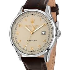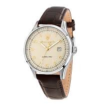 Reloj Maserati Hombre R8851124004 Piel Marrón Acero Analógico. Caja de acero de 42mm de diámetro. Bisel plateado. Correa de piel marrón. Cierre hebilla. Esfera blanca. Multifunción calendario. Cristal mineral. Movimiento quartz. Sumergible 100m.