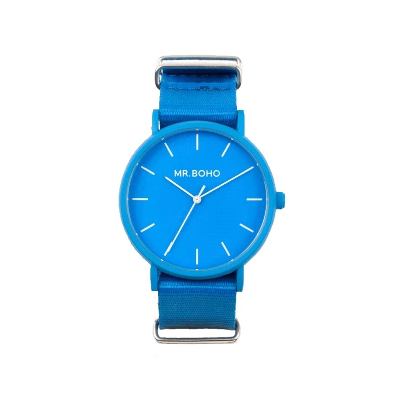 RELOJ DE CUARZO. CAJA AZUL. ESFERA AZUL. CORREA DE NILON AZUL. MEDIDAS DEL RELOJ: O 40 mm. RESISTENTE AL AGUA 3 ATM.