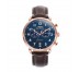 Esfera en azul agujas en rose e índices números arábigos en blanco.