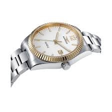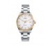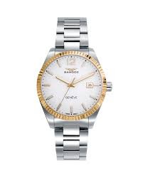 Reloj de Hombre Sandoz Casuel, tres agujas con calendario a las 3, caja de acero bicolor con bisel Ip dorado y brazalete, esfera blanca con índices y números árabes.