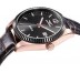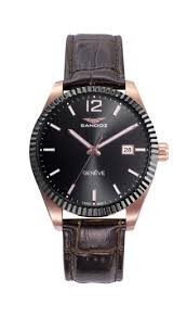 Reloj de Hombre Sandoz Casuel, tres agujas con calendario a las tres, caja de acero con Ip rosa y bisel en negro y correa de piel marrón, con esfera negra y agujas en color rosa.