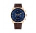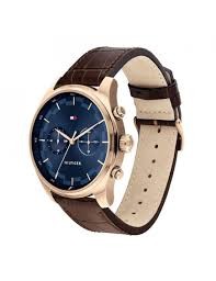 Reloj Tommy Hilfiger para hombre de la colección Sawyer fabricado en piel color marrón y acero inoxidable bañado en oro. Estamos ante un reloj de diseño elegante y máximo atractivo compuesto por caja de 44mm de diámetro en baño de oro con esfera azul con diales y agujas doradas movidas por mecanismo de cuarzo analógico Multifunción protegido por cristal mineral. Su correa es de piel en color marrón con cierre de hebilla. Resistente al agua hasta 50 metros.