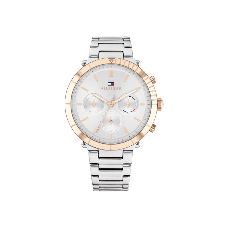 Reloj Tommy Hilfiger para mujer de la colección Emery fabricado en acero inoxidable plateado y rosado. Estamos ante un reloj de estilo clásico y elegante combinado con diseño atractivo y original compuesto por caja rosada de 38mm de diámetro con esfera plateada en contraste con sus diales y agujas rosadas movidas por mecanismo de cuarzo multifunción protegido por cristal mineral. Su correa está compuesta por eslabones plateados con cierre desplegable. Resistente al agua hasta 30 metros.