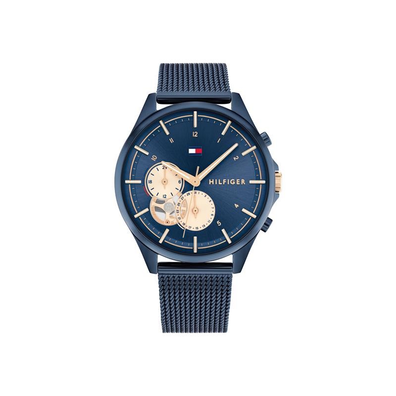 Reloj Tommy Hilfiger para mujer de la colección Quinn fabricado en acero inoxidable azul. Estamos ante un elegante reloj de diseño clásico con caja dorada de 38mm de diámetro que contiene esfera azul con índicies y agujas doradas movidas por mecanismo Multifunción protegido por cristal mineral. Su correa es de malla milanesa en color azul con cierre desplegable. Resistente al agua hasta 30 metros.