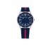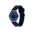 Fabricado en acero inoxidable y correa de silicona azul con franja roja. Resistencia al agua 30 metros.