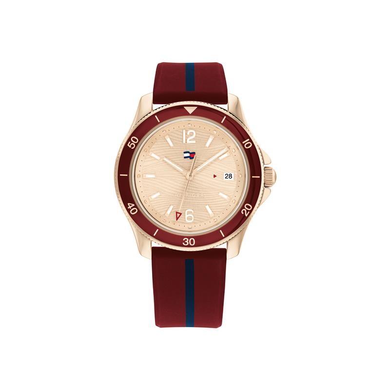 Reloj Tommy Hilfiger para mujer de la colección Brooke fabricado en acero inoxidable rosado y silicona granate. Estamos ante un reloj de diseño puramente femenino y lleno de elegancia. Su correa es de 36mm de diámetro con esfera en rosado con índices y agujas luminiscentes movidas por mecanismo de cuarzo analógico confunción de calendario, todo ello protegido por cristal mineral. Su correa es de silicona en color granate con una franja central en azul marino. Su cierre es de hebilla. Resistente al agua hasta 50 metros.