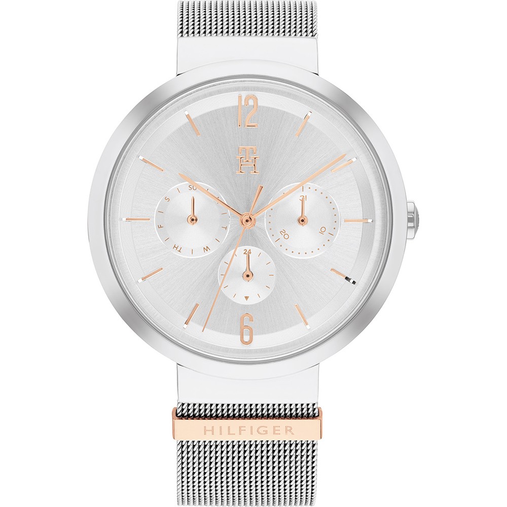 Este reloj marca Tommy Hilfiger tiene una caja de Inox con un diámetro de 40 mm y cuenta con una correa de metal.
