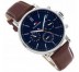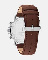 Reloj Tommy Hilfiger para hombre de la colección Tyson fabricado en piel y acero inoxidable. Estamos ante un reloj de diseño elegante y atractivo compuesto por caja en plateado de 43mm de diámetro con esfera azul que contiene índices y agujas en plateado movidas por mecanismo multifunción protegido por cristal mineral. Su correa es de piel marrón con cierre de hebilla. Resistente al agua hasta 5 ATM.
