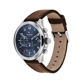Reloj Tommy Hilfiger para hombre de la colección Asher fabricado en acero inoxidable plateado y piel marrón. Se trata de un reloj de diseño atractivo y elegante que cuenta con caja plateada de 48mm de diámetro con esfera azul que contiene índices y agujas en plateado movidas por mecanismo multifunción protegido por cristal mineral. Su correa está fabricada en piel marrón con cierre de hebilla. Resistente al agua hasta 50 metros.