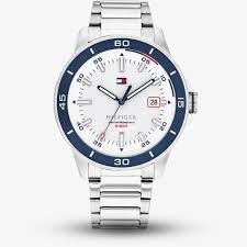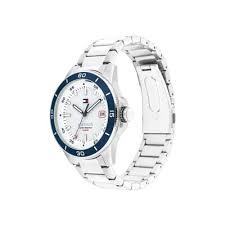 Con una resistente caja y brazalete de acero inoxidable, este audaz reloj destaca por su nítida esfera blanca y su impactante bisel azul. Las manecillas y los índices luminosos garantizan su visibilidad de día y de noche, mientras que los colores característicos de Hilfiger le dan un toque de estilo icónico.