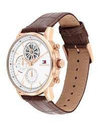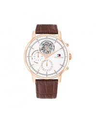 Reloj para hombre de la reconocida marca Tommy Hilfiger modelo Stewart, está elaborado con acero inoxidable. Su esfera color blanca cuenta con cristal mineral y 3 esferas multifuncionales, además de contar con segundero en oro rosado. Correa de piel color marrón, funcionamiento de Quarzo. Cierre de hebilla.