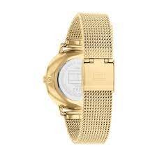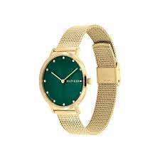 Reloj Tommy Hilfiger para mujer de la colección PIPPA fabricado en acero inoxidable con baño dorado. Estamos ante un reloj de máxima elegancia y diseño femenino compuesto por caja dorada de 34mm de diámetro con esfera verde que contiene índices formados por cristales brillantes y agujas doradas movidas por mecanismo analógico. Todo ello protegido por cristal mineral. Su correa es de malla milanesa con cierre plegable. Resistente al agua hasta 30 metros.