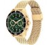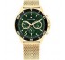 Reloj Tommy Hilfiger para hombre de la colección Jordan fabricado en acero inoxidable dorado. Estamos ante un reloj de diseño elegante y atrevido compuesto por caja de 43mm de diámetro con bisel en color negro. Su esfera es verde y contiene indicadores y agujas en dorado movidas por mecanismo multifunción. Todo ello protegido por cristal mineral. Su brazalete es de malla milanesa en dorado con cierre deslizante de seguridad. Resistente al agua hasta 5 ATM.