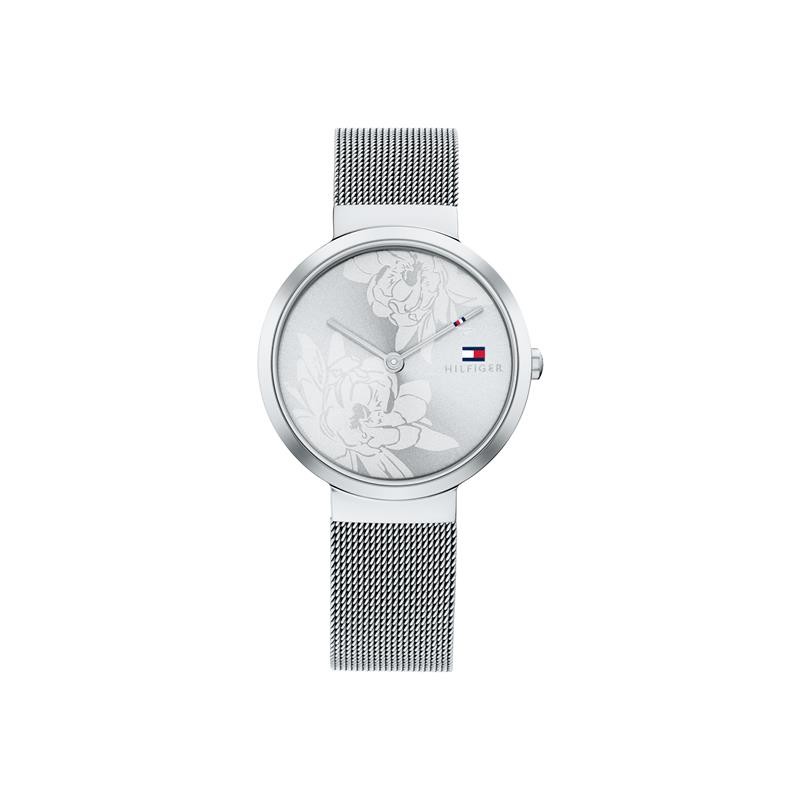 Reloj Tommy Hilfiger para mujer de la colección Libby fabricado en acero inoxidable plateado. Se trata de un atractivo y original reloj con caja plateada de 32mm de diámetro con esfera plaetada con detalles florales y agujas movidas por mecanismo de cuarzo analógico protegido por cristal mineral. Su correa es de malla milanesa en plateado con cierre desplegable. Resistente al agua hasta 30 metros.