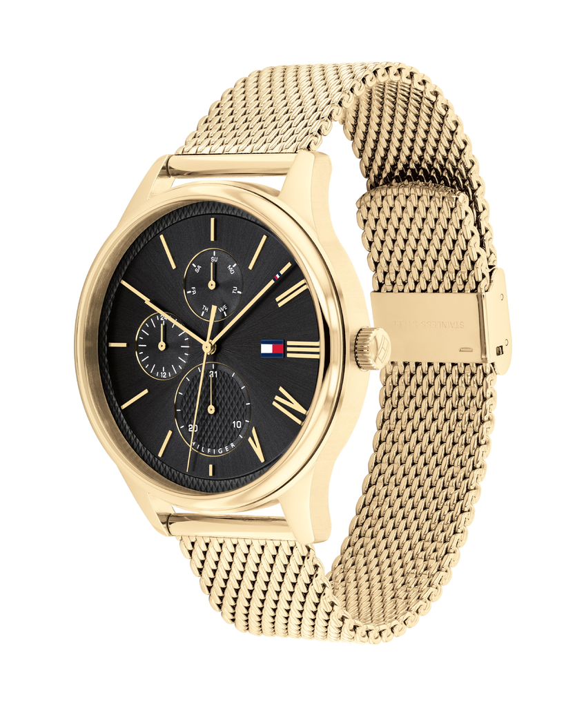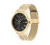 Reloj multifunción, caja de 44mm de acero inoxidable pavonada en oro amarillo, esfera negra tornasolada. Brazalete de malla de acero inoxidable pavonado en oro amarillo. 5 ATM.