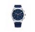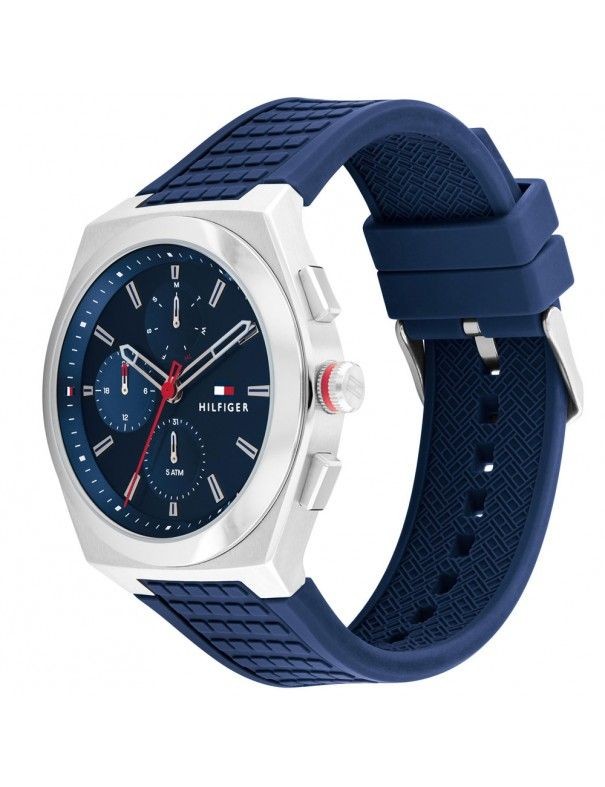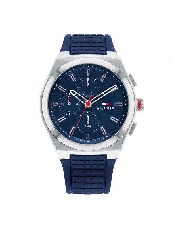 Reloj Tommy Hilfiger Hombre Connor 1791899, analógico multifunción. Caja de acero inoxidable de 44mm, esfera azul. Correa de silicona azul. Cristal mineral. Sumergible a 5ATM, por lo que es apto para ducha y baño sin inmersión.
