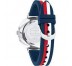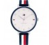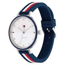 Reloj de señora Tommy Hilfiger con movimiento de cuarzo analógico. Caja de acero redonda, esfera de color plata, cristal mineral. Pulsera de caucho con los colores de la bandera de tommy hilfiger.