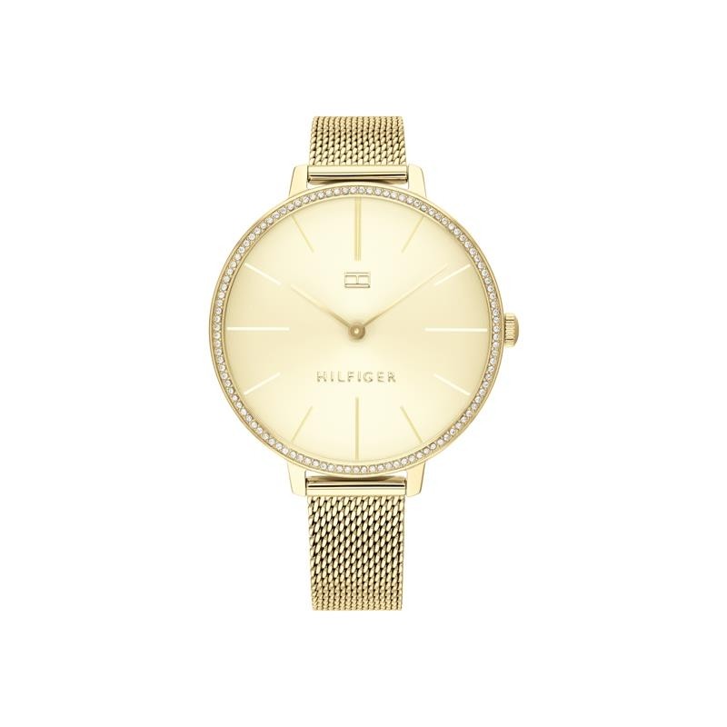 Reloj Tommy Hilfiger para mujer de la colección Kelly en color dorado. Cuenta con caja de 38mm de diámetro cuya circunferencia está rellena de circonitas brillantes con esfera dorado y movimiento de cuarzo analógico protegido por cristal mineral. Su correa es de tipo brazalete con cierre desplegable. Resistente al agua hasta 3 ATM