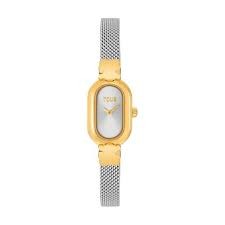 Reloj analógico joya TOUS Oval Icon con brazalete de acero inoxidable y acero dorado. Diámetro caja: 18 mm x 28,5 mm. Cristal mineral plano ovalado. Funciones: horas y minutos. Movimiento: analógico de cuarzo japonés. Impermeable: 3 ATM. Brazalete: 8mm x 8mm x 79mm / 8mm x 8mm x 82mm. Cierre con malla milanesa/eslabones ajustable.