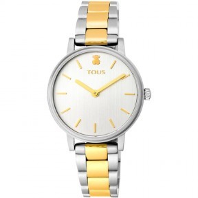 Reloj TOUS para mujer de la colección Tender Time fabricado en acero inoxidable bañado en plata y oro. Estamos ante un elegante reloj lleno de atractivo que le aporta TOUS compuesto de caja plateada de 38mm de diámetro con esfera plateada en combinación con sus índices y agujas doradas movidas por mecanismo de cuarzo analógico protegido por cristal mineral. Su correa está compuesta por eslabones que poseen una franja central bañada en oro y 2 laterales plateadas, posee cierre deployante. Resistente al agua hasta 50 metros.