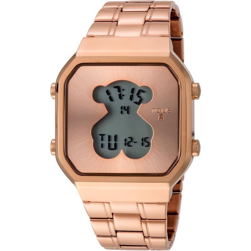 Reloj TOUS DigiBear para mujer fabricado en acero inoxidable de color rosado. Las dimensiones de su caja son de 36,5 x 44mm. Y cuya esfera posee pantalla digital en forma de oso TOUS entre sus funciones destacan la de indicar el día y poseer alarma y luz. Su correa está compuesta por eslabones en color rosado y su cierre es de broche. Resistente al agua hasta 30 metros.
