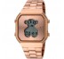dimensiones caja: 36,5mm x 44mm. Material caja: acero inoxidable color Rosado. Material correa: acero inoxidable en color rosado. Movimiento analógico. Resistencia al agua 3 atm. Tipo de cristal: normal. Cierre desplegable con pulsadores. Funciones: hora, minutos, segundos, mes, día, día de la semana, alarma, cronógrafo, formato en 12 o 24 horas y pantalla con luz.