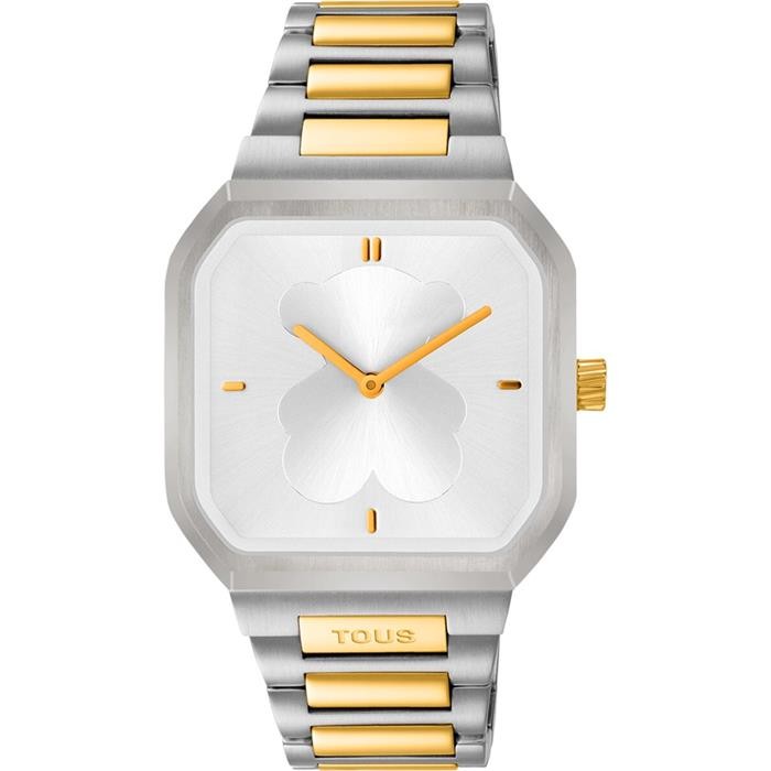Reloj TOUS para mujer de la colección D-Bear fabricado en acero inoxidable plateado y dorado. Estamos ante un original y atractivo reloj compuesto por caja de 36,5 x 44mm. Este atractivo reloj cuenta esfera plateada en forma de osito con mecanismo de cuarzo analógico protegido por cristal mineral. Su brazalete lo forman eslabones plateados con franja central dorada con cierre desplegable mediante pulsadores. Resistente al agua hasta 3 ATM.