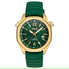 reloj Tous Now GMT 3000133600 automático nácar verde unisex, tiene la caja de acero inoxidable octogonal con IPG dorado. La correa de silicona verde. El cristal mineral, el movimiento automático y el display analógico. Diámetro: 42 mm. Impermeabilidad: 10 ATM. Tipo de cierre: Cierre de hebilla. Funciones: GMT, tres agujas y calendario.
