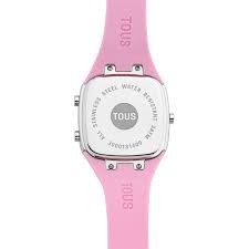 Reloj digital TOUS B-Time con correa de silicona en color rosa y caja de acero inoxidable. Pantalla de cristal líquido (LCD) con luz. Diámetro caja: 36,5 x 46,2 mm. Funciones: hora en 12 o 24 horas, minutos, segundos, día, mes y día de la semana, señal horaria, cronógrafo 1/100 segundos, cuenta atrás y 5 alarmas. Impermeable a 3 ATM. Batería: 3V litio CR2025 / 2,5 gramos (litio 0,003 gramos). Cierre hebilla normal con trabillas de acero.