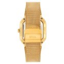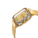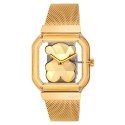 Reloj TOUS para mujer de la colección D-Bear Party fabricado en acero inoxidable dorado. Este atractivo reloj cuenta con caja de policarbonato en plateado de 48mm de ancho con esfera transparente qaue contiene el osito TOUS en dorado y agujas movidas por mecanismo de cuarzo analógico protegido por cristal mineral. Su brazalete es de malla milanesa en dorado con cierre deslizante de seguridad. Resistente al agua hasta 3 ATM.