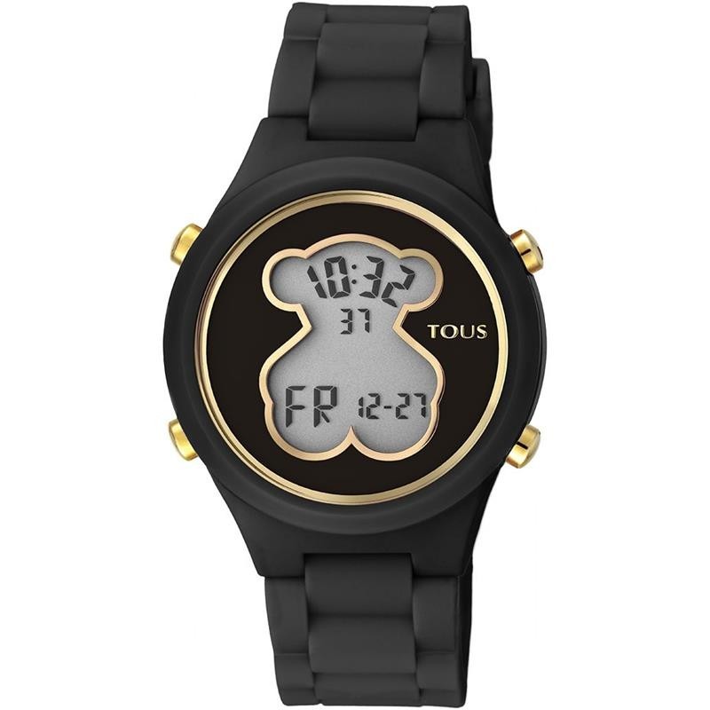 Reloj TOUS DigiBear para mujer en color negro fabricado en silicona. Este reloj combina el estilo deportivo y a la vez elegante y sofisticado de la marca TOUS, en color negro, dispone de caja de 38mm de diámetro en cuya esfera se encuentra una pantalla digital en forma del osito TOUS. Sus botones son en color dorado, tiene cierre de hebilla y resistencia al agua hasta 50 metros.