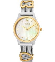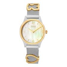 Reloj Tous Epic Icon Mesh Ss/Iprg para mujer 3000136000, modelo de caja redonda en acero, al igual que el brazalete, con detalles de figuras icónicas de la marca en dorado. Fondo en nácar con el nombre de la marca en dorado y con los marcadores al mismo tono.