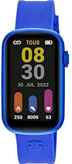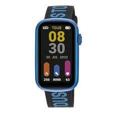 Reloj smartwatch TOUS T-Band con doble correa intercambiable y caja de PC azul. Correa de nylon con logo rapport en azul sobre base azul marino y correa de silicona en color azul con oso posicionado. Compatibilidad: Android 7.0 y iOS 12.0 o superior. Pantalla/LDC: táctil rectangular de 1,47 pulgadas TFT-DLC en color (Full Touch). Sistema operativo: RT OS. Conectividad: Bluetooth versión BLE 5.0. Memoria RAM: 128 kb, ROM Flash de 64 MB. Batería: 140 mAh, acumulador de batería 3.8V Litio/2,9 gr, recargable con cable magnético, 5-7 días en funcionamiento y 8-10 en reposo. Chipset: Realtek RTL8762CK y Frecuencia cardíaca: HRS 3300- ARM Cortex-M0 - 53MHz de velocidad. Impermeabilidad: IP68. Funciones: 5 Esferas TOUS y una puede ser intercambiada desde la TOUS WEAR APP, horas, minutos, mes, día, día de la semana, actividad diaria con contador de pasos, contador de calorías y distancia recorrida en millas o kilómetros, deportes (caminar, correr, senderismo, ciclismo, cinta/elíptica, yoga y basquetbol), frecuencia cardiaca, monitorización del sueño, presión sanguínea (aproximación), oxígeno en sangre (aproximación), notificaciones (llamadas, WhatsApp, email, SMS, Facebook, etc.), clima, función ovárica, cronógrafo 1/10 segundos, control música, encontrar móvil y control cámara. Cierre hebilla de aluminio.