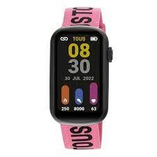 Reloj smartwatch TOUS T-Band con doble correa intercambiable y caja de PC negro. Correa de nylon con logo rapport en negro sobre base fucsia y correa de silicona en color negro con oso posicionado. Compatibilidad: Android 7.0 y iOS 12.0 o superior. Pantalla/LDC: táctil rectangular de 1,47 pulgadas TFT-DLC en color (Full Touch). Sistema operativo: RT OS. Conectividad: Bluetooth versión BLE 5.0. Memoria RAM: 128 kb, ROM Flash de 64 MB. Batería: 140 mAh, acumulador de batería 3.8V Litio/2,9 gr, recargable con cable magnético, 5-7 días en funcionamiento y 8-10 en reposo. Chipset: Realtek RTL8762CK y Frecuencia cardíaca: HRS 3300- ARM Cortex-M0 - 53MHz de velocidad. Impermeabilidad: IP68. Funciones: 5 Esferas TOUS y una puede ser intercambiada desde la TOUS WEAR APP, horas, minutos, mes, día, día de la semana, actividad diaria con contador de pasos, contador de calorías y distancia recorrida en millas o kilómetros, deportes (caminar, correr, senderismo, ciclismo, cinta/elíptica, yoga y basquetbol), frecuencia cardiaca, monitorización del sueño, presión sanguínea (aproximación), oxígeno en sangre (aproximación), notificaciones (llamadas, WhatsApp, email, SMS, Facebook, etc.), clima, función ovárica, cronógrafo 1/10 segundos, control música, encontrar móvil y control cámara. Cierre hebilla de aluminio.