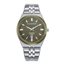 Reloj Viceroy para hombre de la colección Swiss Made fabricado en acero inoxidable plateado. Estamos ante un reloj de diseño clásico y elegante compuesto por caja de 40mm de diámetro con bisel plateado que contiene esfera verde que posee indicadores en formas de barras plateadas al igual que sus agujas movidas por mecanismo de cuarzo analógico suizo con función de calendario. Todo ello protegido por cristal de Zafiro. Su brazalete está formada por eslabones plateados con cierre desplegable mediante doble pulsador. Resistente al agua hasta 10 ATM.