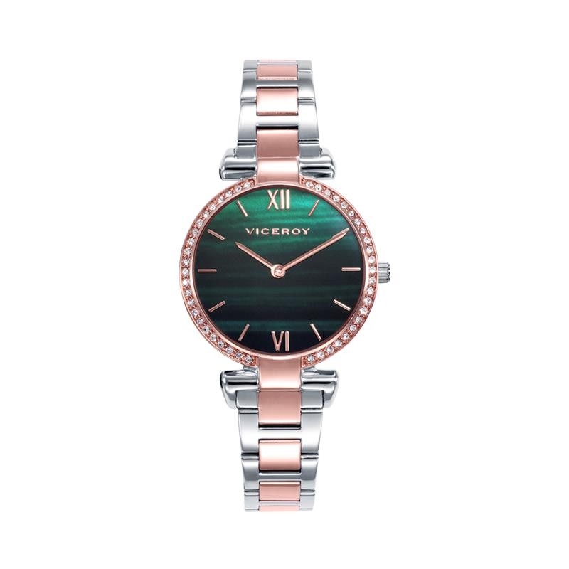 Reloj Viceroy para mujer de la colección Chic fabricado en acero inoxidable plateado y rosado. Este atractivo reloj es de diseño elegante y femenino compuesto por caja en rosado formada por cristales brillantes con esfera verde que cuenta con indicadores y agujas en rosado movidas por mecanismo de cuarzo analógico. Todo ello protegido por cristal mineral. Su brazalete lo forman eslabones plateados y rosados con cierre desplegable mediante doble pulsador. Resistente al agua hasta 5 ATM.