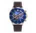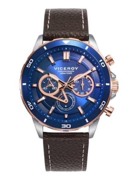 Reloj de hombre cronógrafo caja bicolor de acero e Ip rosa con bisel de aluminio azul 10 atm y correa de piel marron con esfera azul con indices y agujas de horarias y contadoras en color rosa, cristal mineral.