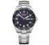 Esfera en azul con índices números arábigos y agujas luminiscentes, aguja segundero en rojo.