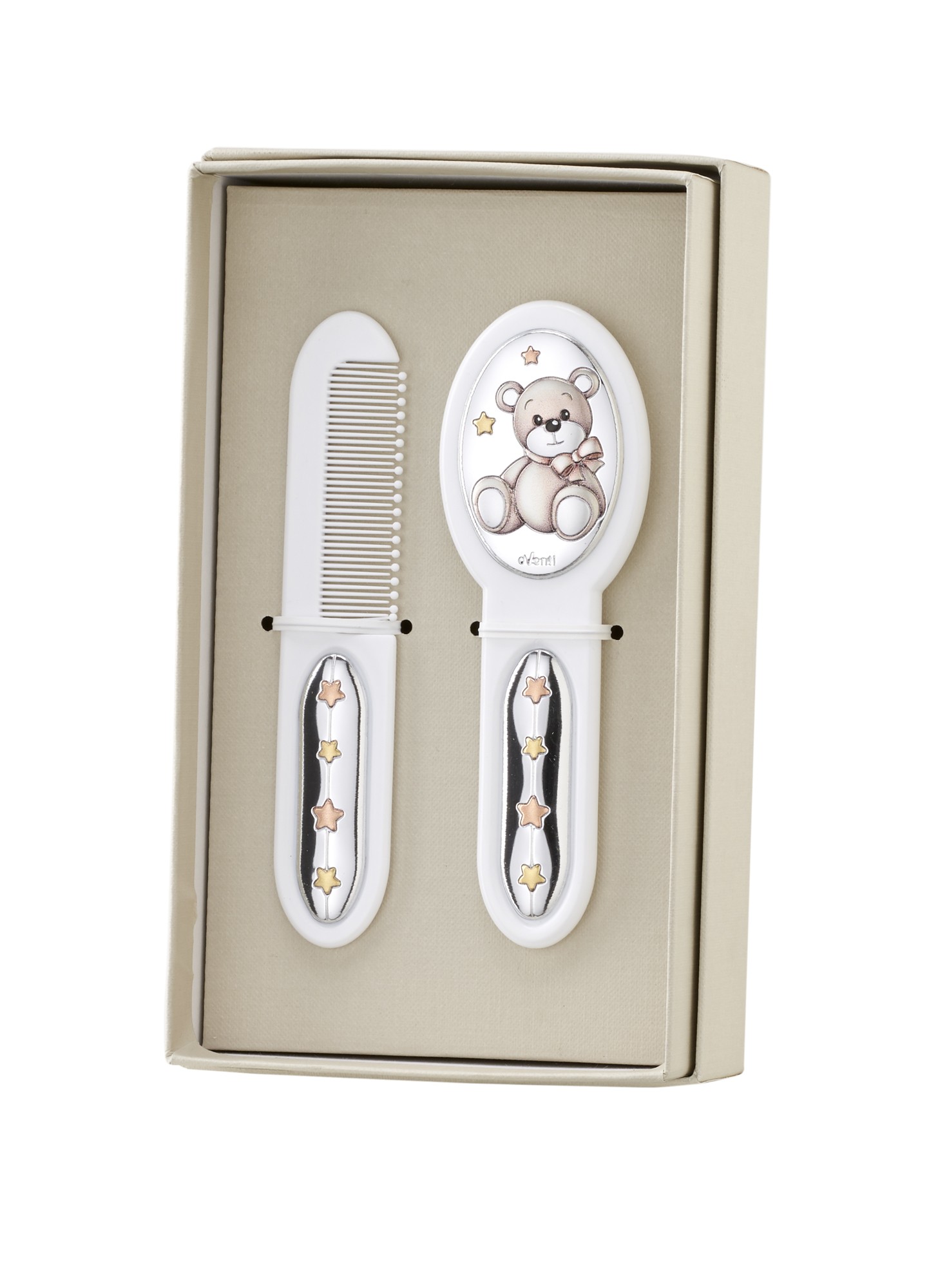 SET DE CEPILLO Y PEINE BILAMINADO EN PLATA CON OSO EN COLOR BLANCO EV3466/04B
