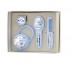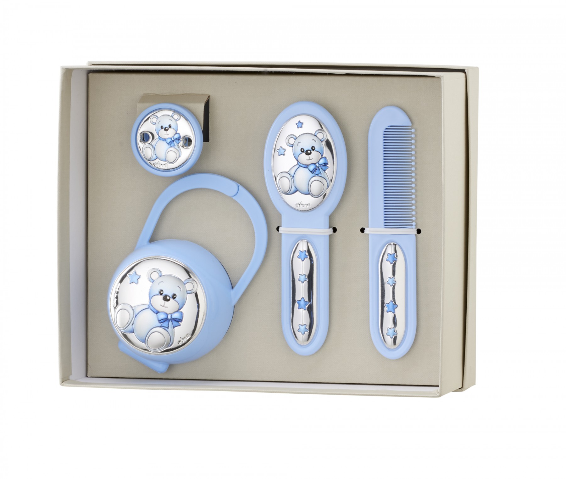 SET DE PINZA CHUPETERO CEPILLO Y PEINE BILAMINADO EN PLATA CON OSO EN COLOR AZUL