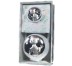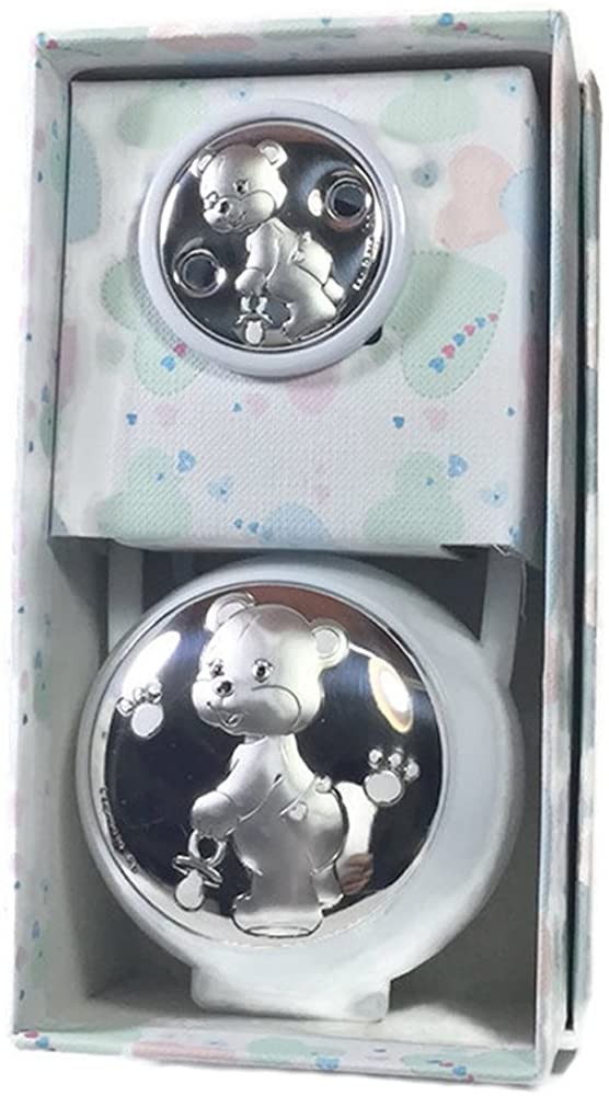 . La pinza de chupete es de forma redonda de color blanco con una placa de metal bilaminado en plata de ª ley con la imagen de un osito con detalles esmaltados en color blanco. El portachupete es de color blanco con una placa de metal bilaminado en plata de ª ley con la imagen de un osito con detalles esmaltados en color blanco.