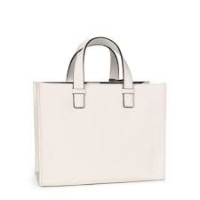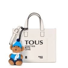 Bolso shopping mediano TOUS de la colección Amaya Dulzena de vinilo efecto piel en color blanco. Cierre con botón magnético. Asas de mano y asa de bandolera ajustable y extraíble. Bolsillo exterior plano y dos bolsillos interiores con cremallera. El bolso cuenta con una borla oso de peluche en color azul. Medidas: 15x21,5x27,5 cm.