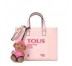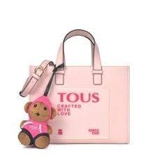 Bolso shopping mediano TOUS de la colección Amaya Dulzena de vinilo efecto piel en color rosa. Cierre con botón magnético. Asas de mano y asa de bandolera ajustable y extraíble. Bolsillo exterior plano y dos bolsillos interiores con cremallera. El bolso cuenta con una borla oso de peluche en color rosa. Medidas: 15x21,5x27,5 cm.