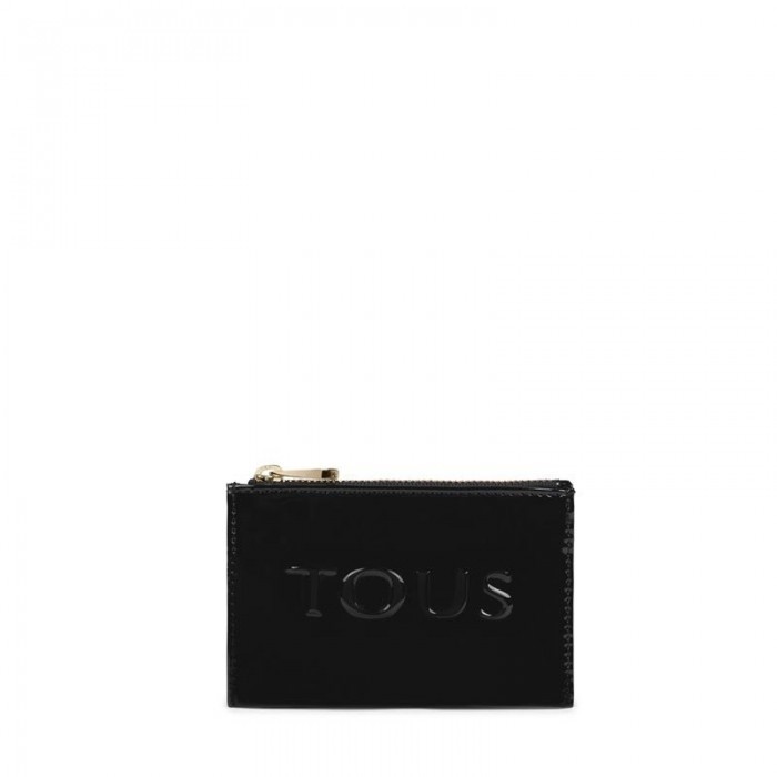 Monedero TOUS para mujer de la colección Dorp fabricado en vinilo efecto charol en color negro. Se trata de un monedero el cual posee en su parte delantera del logotipo TOUS en relieve, cuenta con cierre de cremallera y en su exterior posee 3 compartimentos para tarjetas.